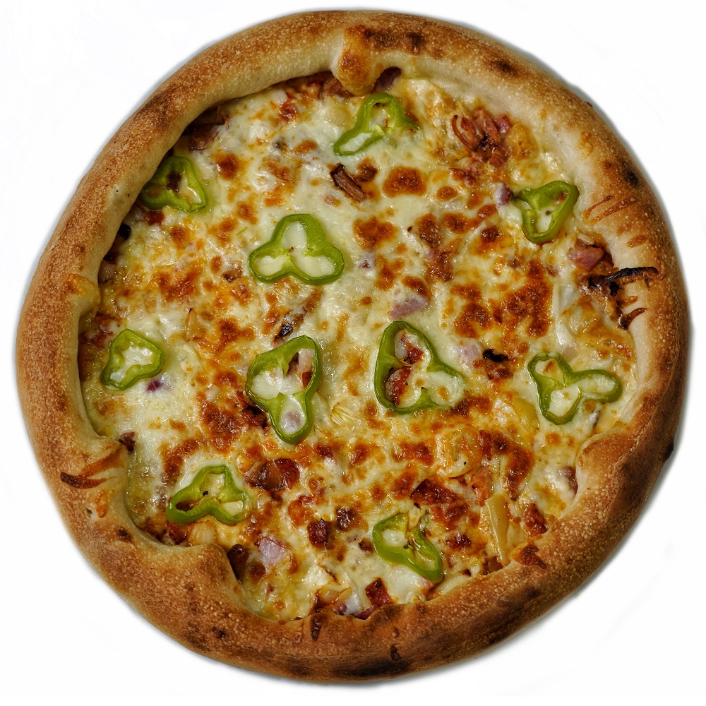 paradicsomos alap, tarja, sonka,bacon, lilahagyma, tojás, csípős pfefferoni, mozzarella